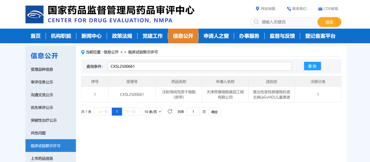 2025年11月3日, 天津昂賽細(xì)胞基因工程有限公司申報的注射用間充質(zhì)干細(xì)胞(臍帶)治療難治性急性移植物抗宿主病(aGvHD)兒童患者的適應(yīng)癥獲得國家藥品監(jiān)督管理局臨床試驗?zāi)驹S可